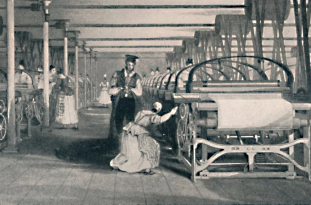 Inside the mill, Bridget stood for twelve hours a day at the power loom, the clatter of machines so loud she probably learned to communicate in gestures, not words. It’s safe to say she likely worked among rows of other women and girls, each one stationed at a power loom—massive, rhythmic machines fed by belts and pulleys spinning from the mill’s central waterwheel.
